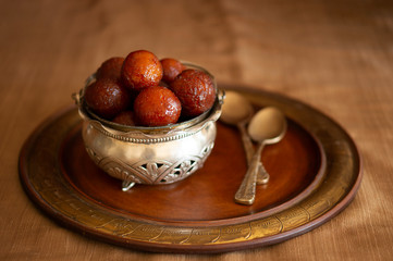 Indian Dessert Sweet Food Gulab Jamun in a traditional metal bow