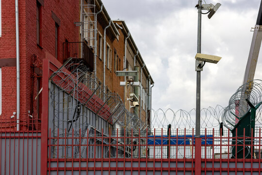barb wire and surveillance cameras over fence in city near red brick building wall at summer day, telephoto closeup with selective focus