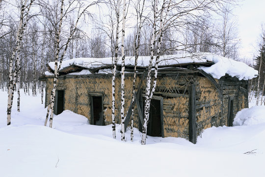 Abandoned Soviet prison in winter in the snow and birch trees in Northern Siberia