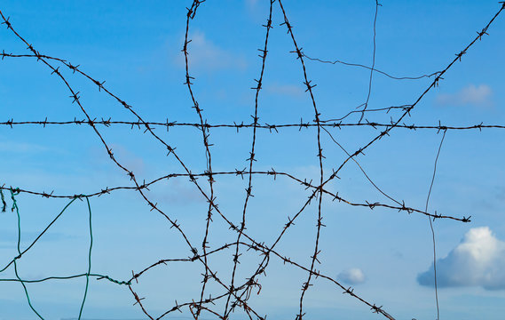barbed wire tangle with blue sky and cloud