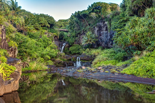 Lush , Tropical and Calm reflection in the morning at oheo gulch or seven pools , Haleakala National Park on the East side of Maui, Hawaii.