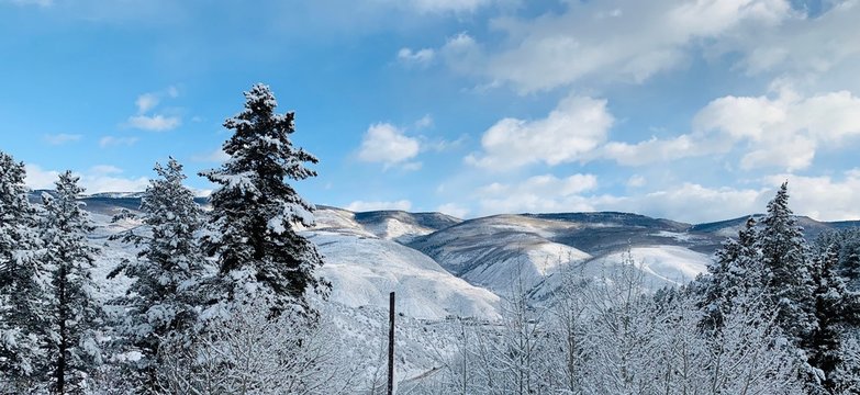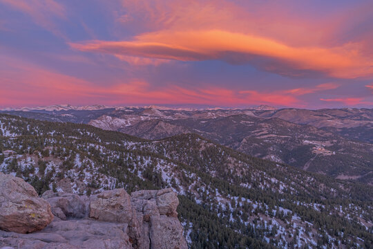 Winter landscape at dawn of the Front Range of the Rocky Mountains from Lost Gulch Overlook, Flagstaff Mountain, Boulder, Colorado, USA