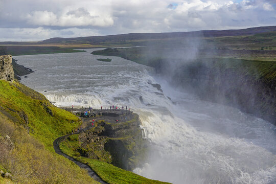 Wonderful waterfall Gullfoss, Golden waterfall in South West Iceland, with many tourists