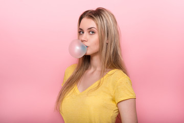 Pretty young woman in knitted pink sweater looking up, chewing, blowing bubble gum balloon isolated on blue turquoise wall background. People sincere emotions, lifestyle concept. Mock up copy space.