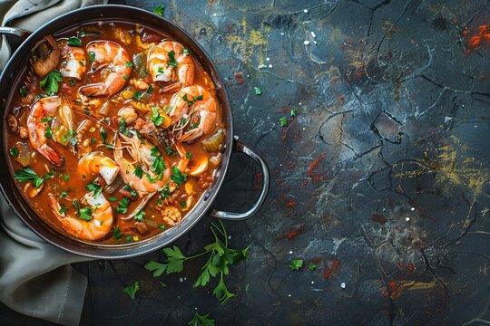 Top view of a traditional New Orleans gumbo with shrimp in a pot on a dark background. French traditional cuisine inspired by Mardi Gras festival