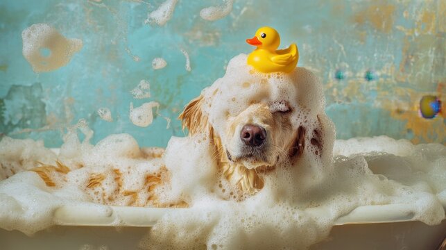 A Golden Retriever dog in a bathtub, covered in bubbly soap with a small yellow rubber duck perched on its head.