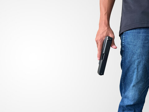 A man wearing a black short-sleeved shirt and jeans stands holding a handgun, symbolizing the killing of people, murder, Active shooting.