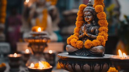 Hindu devotees gather at an ancient temple, light oil lamps and offer prayers in front of a statue of Dattatreya decorated with marigold flowers, Ai generated images