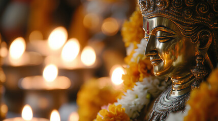 close-up of gold plated Dattatreya statue with intricate ornamental details, jasmine and marigold flowers adorn the statue, Ai generated images