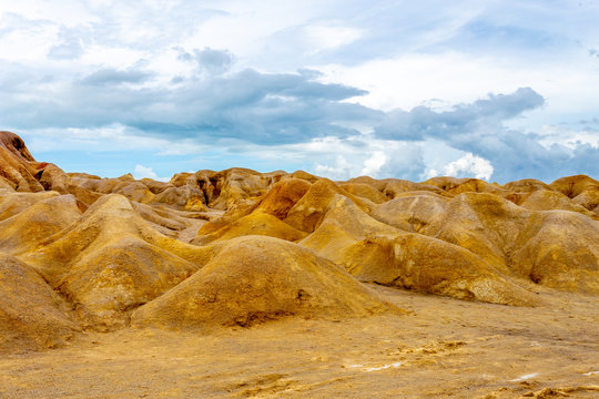 Golden sand desert with clear blue sky and clouds / Gurun pasir emas dengan langit biru cerah dan awan