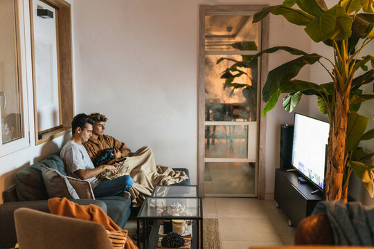 Happy same-sex couple hugging sitting coffee shop close up. Men laughing at date