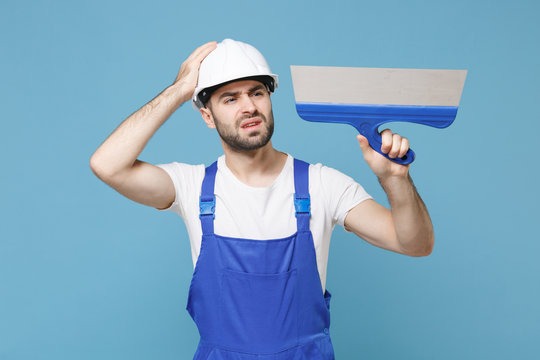 Preoccupied young man in coveralls protective helmet hardhat hold putty knife isolated on blue background studio portrait. Instruments accessories for renovation apartment room. Repair home concept.