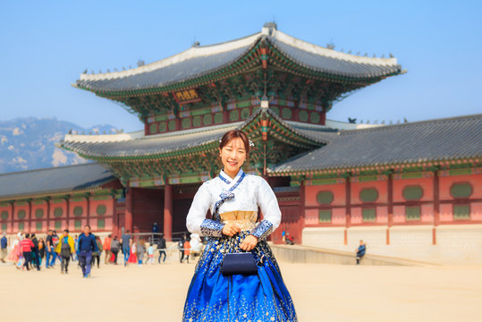 Beautiful Korean woman dressed Hanbok in Gyeongbokgung Palace in Seoul