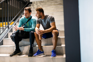 Positive males are having friendly communication in modern gym