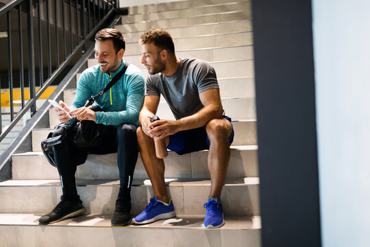 Athletic friends relaxing and conversing at gym