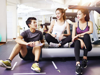 asian young people resting and talking in gym
