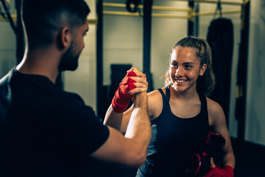 handshake woman with her trainer in gym