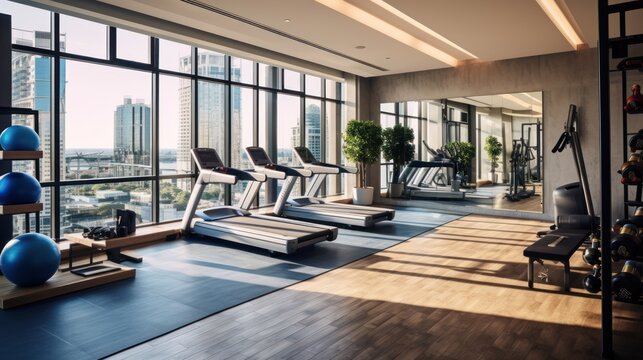 Fully equipped gym with floor to ceiling windows, offering panoramic views while working out. Incorporate modern exercise equipment, a yoga studio, and a refreshing juice bar