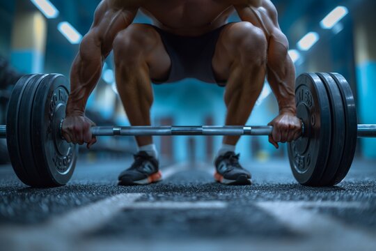 Man lifting barbell in gym with athletic shoes and smartwatch