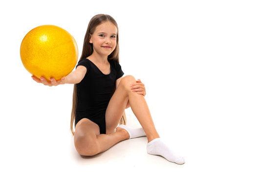 gymnast girl sitting on the floor with gymnastic ball on a white background with copy space