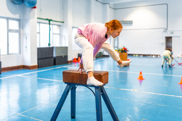 Young girl balancing on pommel horse during gymnastics class at school gym