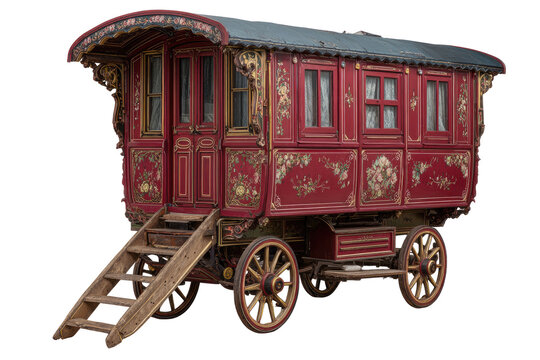 Wagon of a gypsy fortune-teller at the edge of a misty forest. Colorful drapes hang from windows and flickering lanterns around the exterior. Concept of predicting future, divination and mysticism