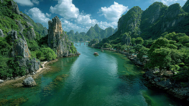 Serenity of ha long bay  unesco site with limestone islands, emerald waters, and boats in vietnam