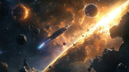 A spacecraft traveling toward a distant exoplanet, symbolizing the search for habitable planets beyond our solar system. Concept of exoplanet exploration.