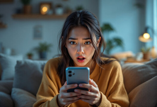 Shocked people of different ages stare at their phones in disbelief after receiving hacked bank account notifications.
