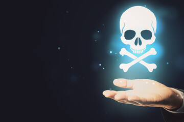 Close up of hand holding glowing white skull hologram on dark background with mock up place for your text. Cyber attack and malware concept.