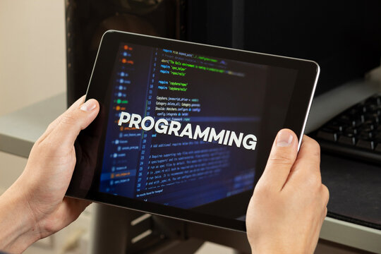 A programmer is browsing the Internet in smart phone to protect a cyber security from hacker attacks and save clients confidential data. Padlock Hologram icons over the typing hands. Formal wear.