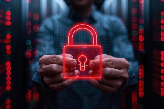 A person holds a glowing red digital padlock in a server room, symbolizing cybersecurity and data protection in a high-tech environment.