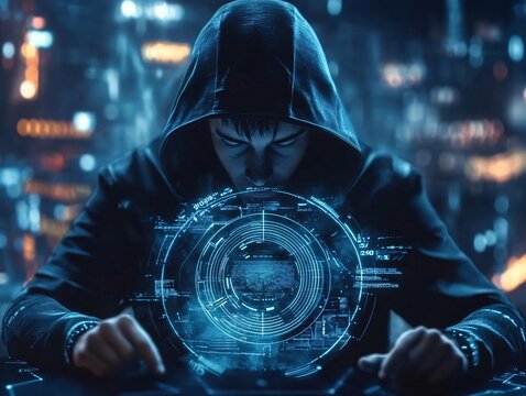 Cybersecurity hacker in futuristic cityscape digital interface nighttime urban environment high-tech concept