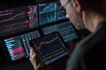 Businessman analyzing data on screens in contemporary office