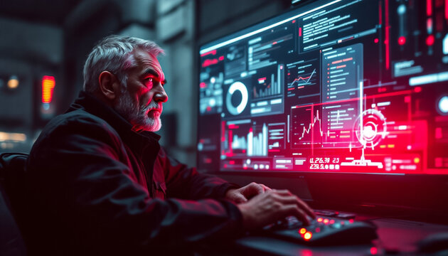Senior Man Monitoring Data on Futuristic Computer Screen