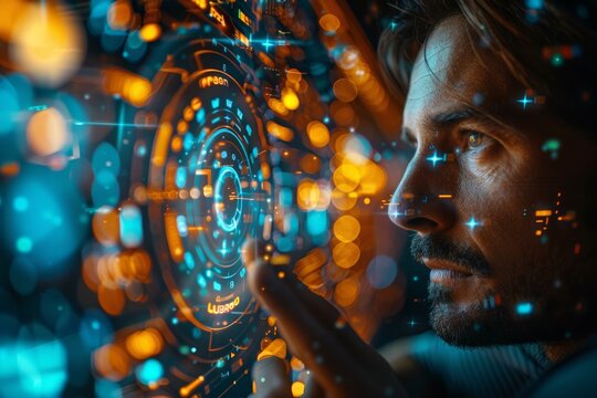 Hacker Analyzing Digital Data With High Tech Interface System Images