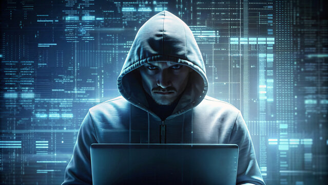 internet security and data protection concept, hacker in dark hoodie hacking into corporate system