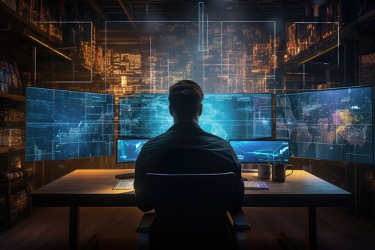 Silhouette of a hacker in a dark room with binary code on the wall, A software engineer engaged in computer work involving data analysis and AI algorithms, captured from the rear view, AI Generated