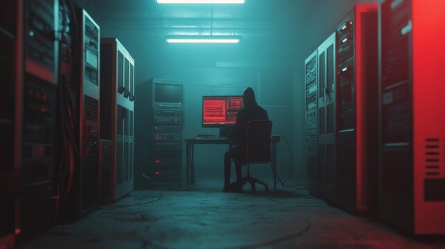 Mysterious figure seated in a dimly lit server room, engaged with glowing screens and technology