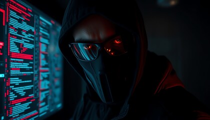 Anonymous hooded hacker engaged in cybercrime, with glowing red data reflected in glasses in a dark room