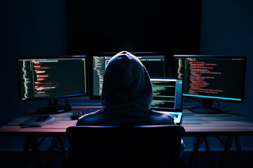 Focused Coder Hooded Figure Engaged with Multiple Monitors Displaying Code, Exploring Cybersecurity and Digital Systems.