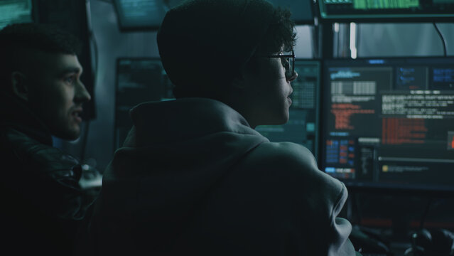 Young male hacker in glasses looking at screen and talking with associate while performing cyber attack on computer in dim room of criminal base