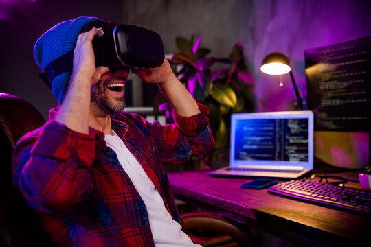 Photo of excited happy guy dressed glasses hat trying new video game modern device indoors workstation workshop home
