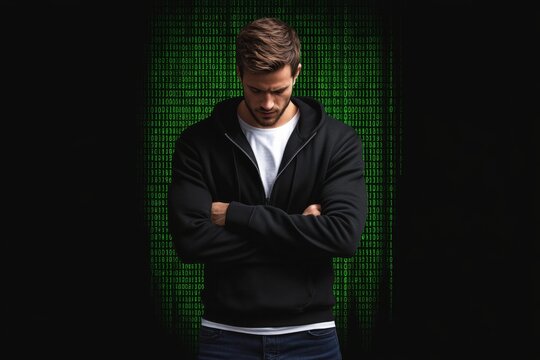 Hacker with green matrix code projected on face and hoodie in digital world
