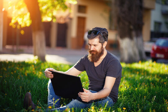 A man with a long beard womanizer and dark hair with gray hair in a shirt and jeans sits on green grass in a park with a laptop and watches funny videos