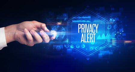 hand holding wireless peripheral with PRIVACY ALERT inscription, cyber security concept