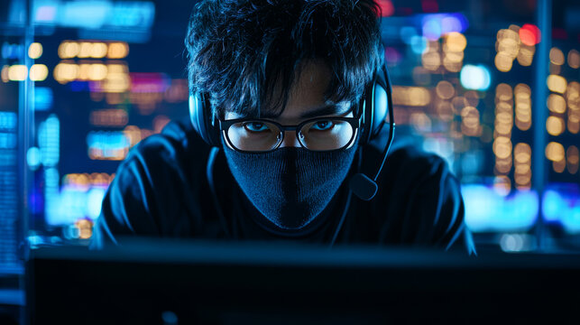 A masked figure focuses intently on digital data, representing themes of cybersecurity, hacking, and the digital landscape.
