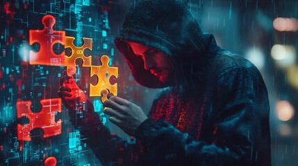 A hacker sits at a desk, immersed in the glow of a computer screen, meticulously manipulating code and unraveling digital mysteries