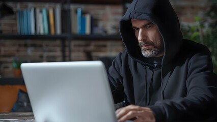 A hacker in a black hoodie is using a laptop. Concept Cybersecurity, Technology, Cybercrime, Hacking, Data Breach
