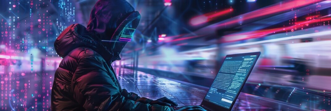 A hacker types on a laptop in a crowded metro station at night, illustrating the potential risks of using public Wi-Fi networks. Generative AI